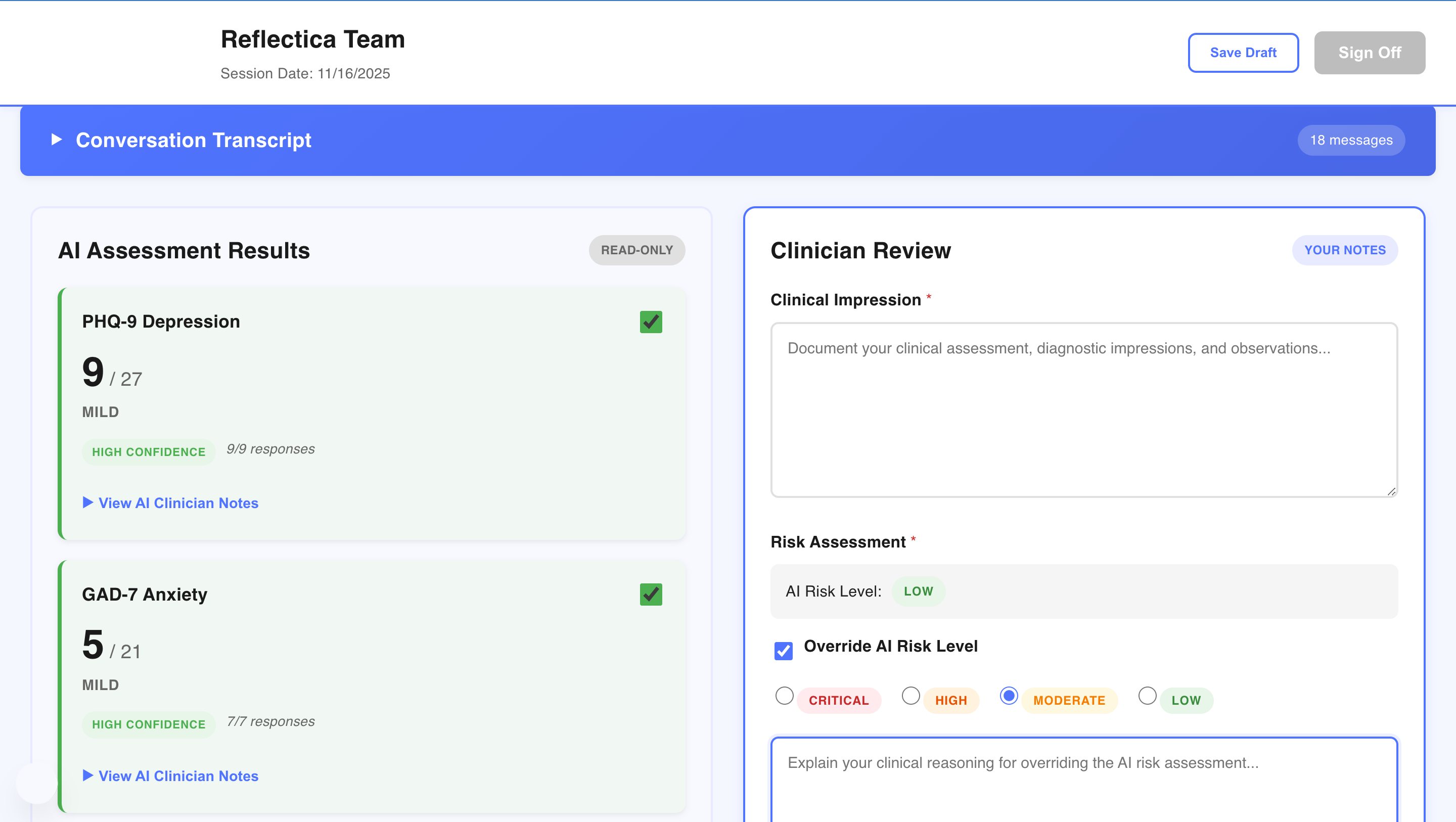 Our mission is grounded in the belief that mental health care should be as accessible and effective as physical health care. Yet across the U.S., millions struggle to access timely support, often facing long wait times, administrative bottlenecks, and overwhelmed care systems before they ever speak with a clinician. Reflectica focuses on improving the very first step in care: intake and screening. By using conversational AI to help clinics collect structured, clinically meaningful information before the first appointment, we reduce delays, ease administrative burden, and help clinicians begin care with clarity and context.
